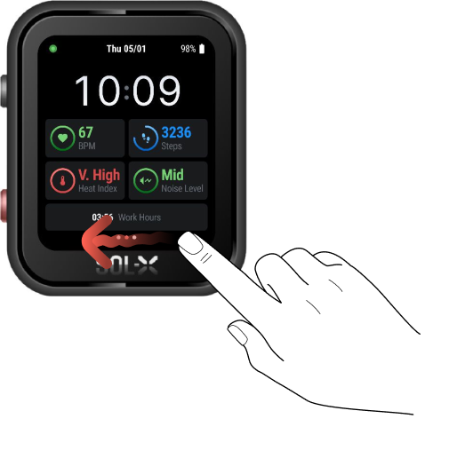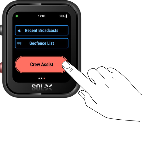 The SOL-X SmartWatch provides quick access to key health and safety features directly from the home screen. This guide explains how to navigate the interface and use the Crew Assist function in case of emergencies.