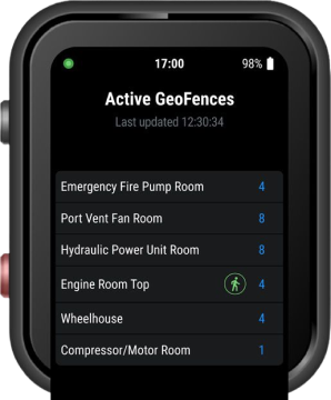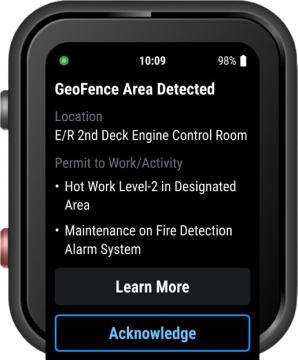 When a GeoFence is active for a particular work zone (e.g., Engine Room, Fire Pump Room), your watch detects your presence and triggers an alert.Scheduled Alerts