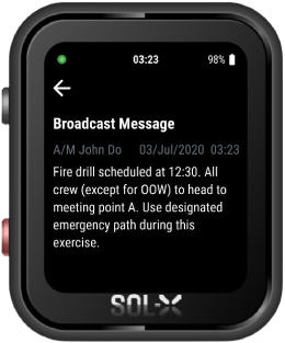 The Broadcast Message feature on the SOL-X SmartWatch ensures that seafarers receive urgent and essential communication instantly, right on their wrist. Whether it’s a fire drill alert, a safety instruction, or a crew directive, messages sent from the dashboard are immediately pushed to all connected devices.
