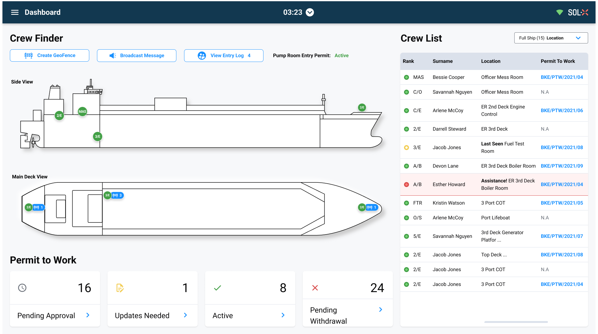 The SOL-X Dashboard enhances visibility and situational awareness on board by providing real-time tracking of crew members and job activity. This article outlines how the User Finder, User List Filter, and interactive icons function within the dashboard interface.