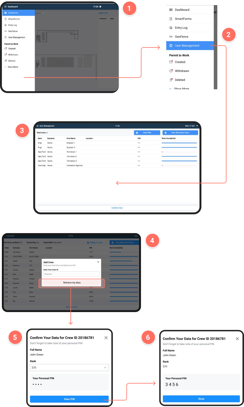 You input his crew ID, tap “Retrieve my data,” verify his rank as 3/O, and set his PIN to 3456.